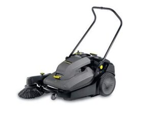 High-productivity push sweeper for indoor and outdoor use, with battery-powered roller and side brushes.