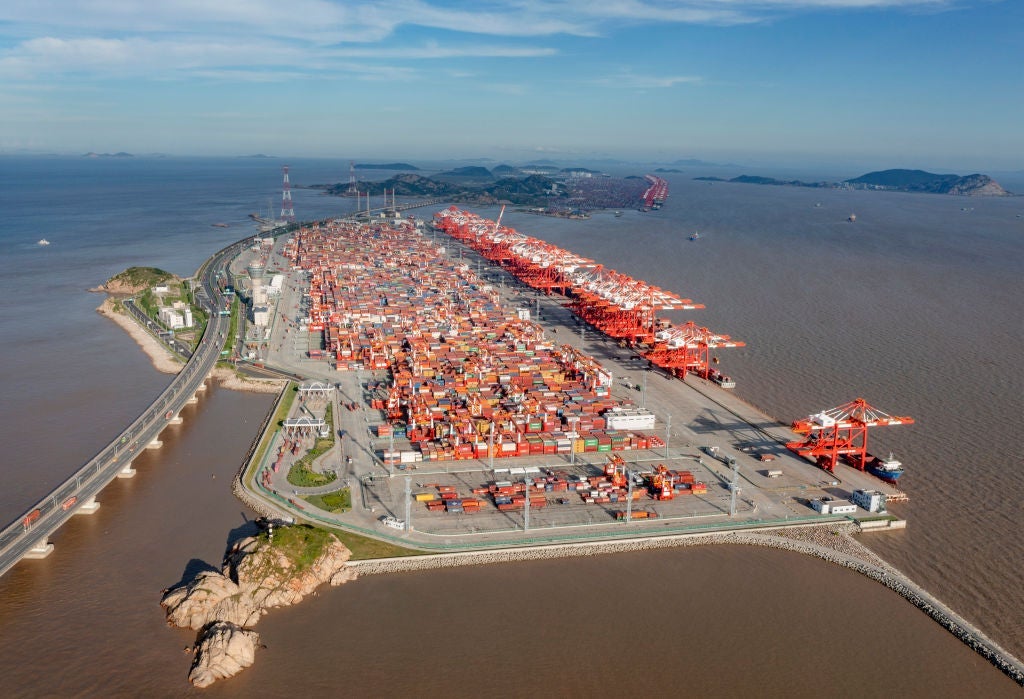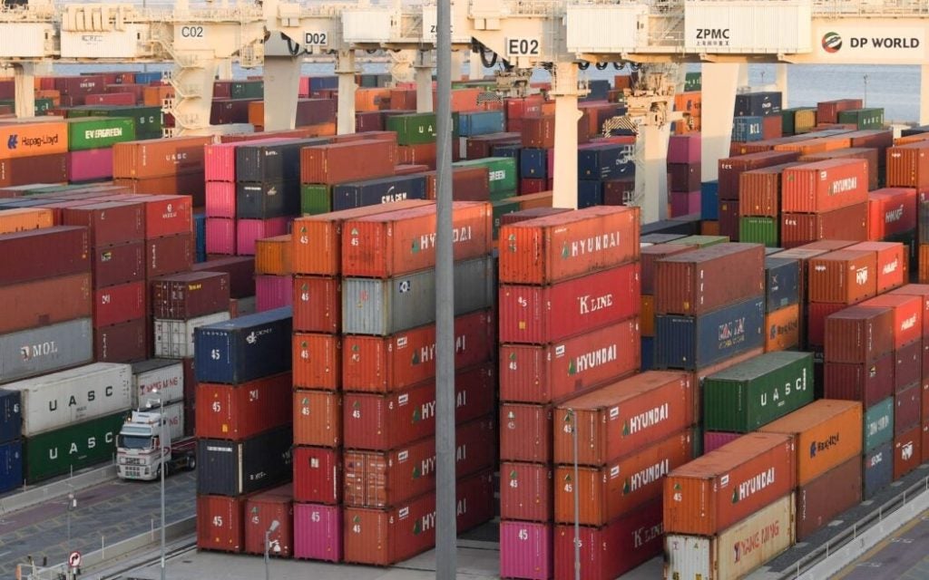 Containers are stacked at the port of Jebel Ali, operated by the Dubai-based logistics company DP World, in June 2020.…
