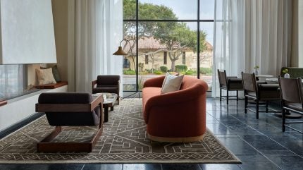 The hotel’s firelit courtyard is suitable for both relaxation and social gatherings. Other amenities include a fitness studio and flexible event spaces.