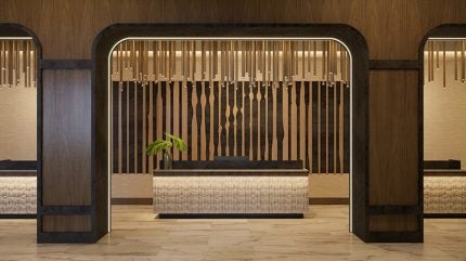 The hotel’s interior will feature a blend of mid-century architecture and modern furnishings, complemented by a mix of brass, marble, dark wood, cognac leather, and glass.