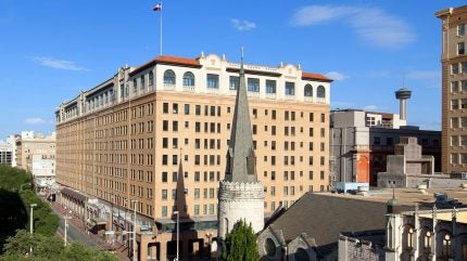 Overlooking Travis Park, the hotel boasts elegant architectural details and vintage-inspired rooms with modern amenities such as pillowtop beds, free Wi-Fi, and black marble tubs.