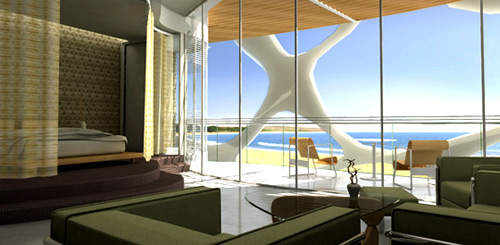 Each property will have its own swimming pool, as well as lush tropical gardens with water features. The design of the 200 room seven-star hotel, with its unique coral-like shape, was designed to mirror the submarine world found in the Red Sea.